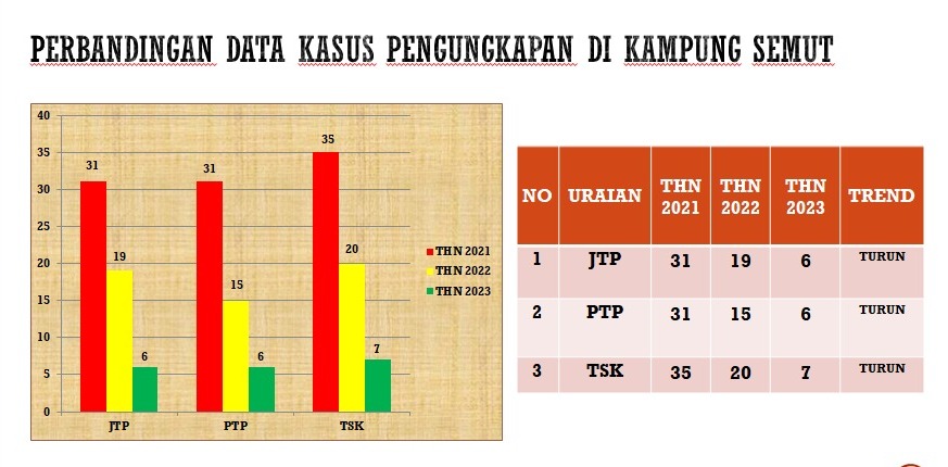 Dirinya juga menjelaskan bahwa dari indeks Data Kasus Pengungkapan di Kampung Semut, Kelurahan Bandar Utama yang tepatnya didirikannya Posko Kampung Bebas Narkoba semakin menurun.