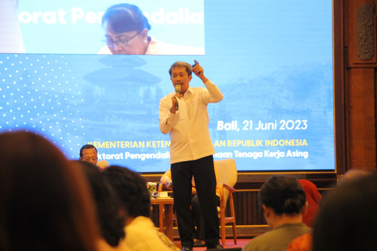 Anggiat Napitupulu menjadi narasumber ketiga setelah narasumber dari Dinas Tenaga Kerja dan ESDM Provinsi Bali dan dari Direktorat Pengendalian Penggunaan TKA Kemnaker.