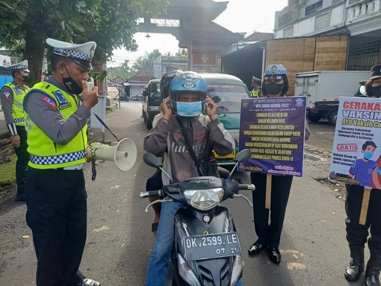 Salah satu Personil Ops Zebra Agung 2022 Polres Klungkung Akp I Gede Puja Artana menegur beberapa masyarakat yang saat mengendarai kendaraan tidak menggunakan helm dan tidak menggunakan masker.