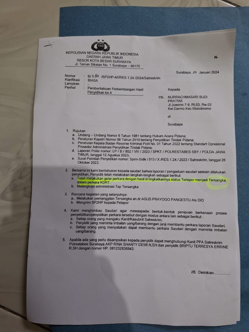 Dari berbagai data yang diperoleh, Polisi pun telah mengirimkan Surat Pemberitahuan Dimulainya Penyidikan (SPDP) ke Kejaksaan Negeri Surabaya, Dengan nomor B/528/X/RES.1.24/2023/Satreskrim Pada 27 Oktober 2023, Serta dalam Surat Pemberitahuan Perkembangan Hasil Penyidikan (SP2HP) ke 4, Sebagaimana hasil gelar perkara bahwa status terlapor ditingkatkan menjadi Tersangka dalam perkara KDRT.